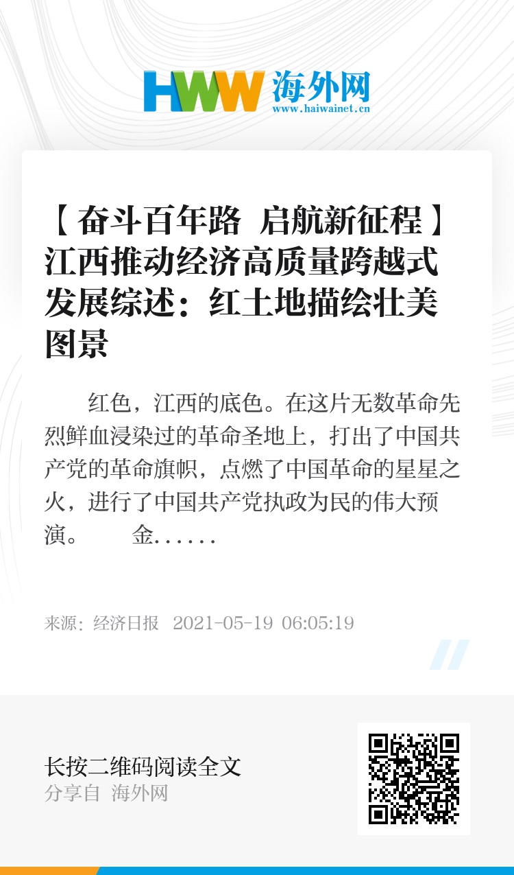 耕耘的五月,火红的江西,激情在燃烧,希望在沸腾。在烽火连天的峥嵘岁月,无数革命先烈用鲜血和生命铸就了伟大的井冈山精神、苏区精神、长征精神,孕育了融入民族血脉和灵魂的红色基因。站在开启全面建设社会主义现代化国家新征程、向第二个百年奋斗目标进军的新的历史方位,4600万赣鄱儿女正传承红色基因,赓续精神血脉,在中国共产党的领导下,立足新发展阶段,贯彻新发展理念,构建新发展格局,坚定不移实施高质量跨越式发展首要战略,奋力谱写全面建设社会主义现代化国家江西篇章,以优异成绩庆祝建党100周年。(经济日报-中国经济网记者 赖永峰 刘 兴)