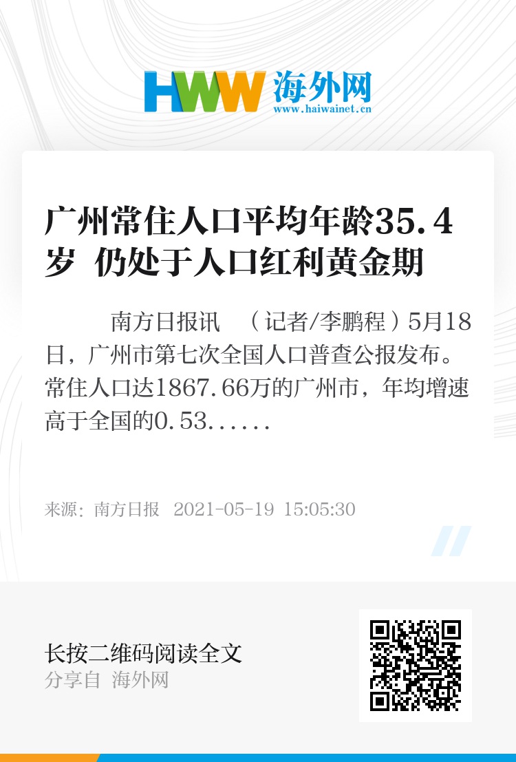 此外,广州全市家庭规模缩小,平均每个家庭户人口为2.22人;城镇人口比重提高2.41个百分点,城镇化率突破85%;常住人口平均年龄为35.4岁,仍然处于人口红利黄金期。