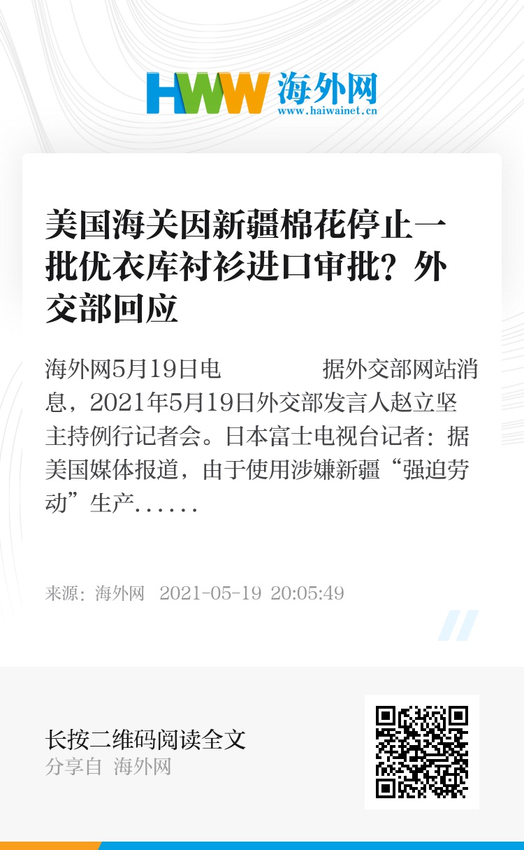 日本富士电视台记者:据美国媒体报道,由于使用涉嫌新疆“强迫劳动”生产的棉花,今年1月美国海关部门停止了一批优衣库衬衫的进口审批。5月10日,优衣库提交未使用新疆棉花的证据,但美方以“证据不足”拒绝采用。你对此有何看法?