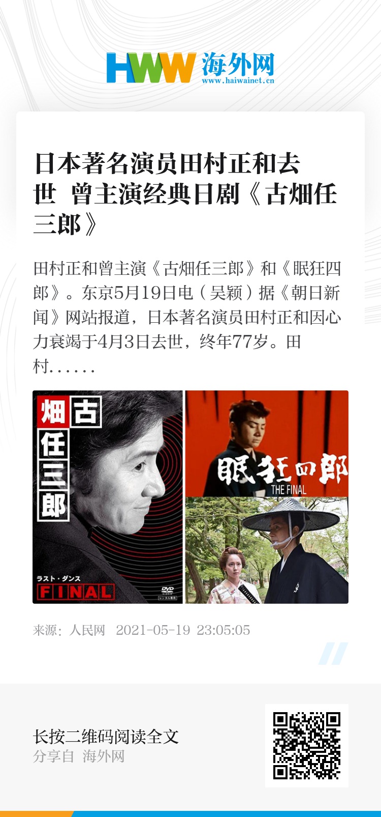 人民网东京5月19日电(吴颖)据《朝日新闻》网站报道,日本著名演员田村正和因心力衰竭于4月3日去世,终年77岁。田村正和的代表作品有电视剧《古畑任三郎》、《眠狂四郎》、《爸爸是主播》、《美丽的人》等。他曾凭借《古畑任三郎》系列电视剧多次获得日剧学院赏大奖。