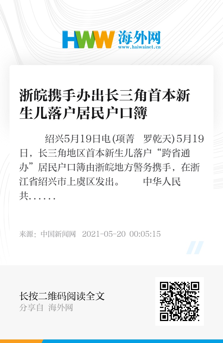 中新网绍兴5月19日电(项菁 罗乾天)5月19日,长三角地区首本新生儿落户“跨省通办”居民户口簿由浙皖地方警务携手,在浙江省绍兴市上虞区发出。
