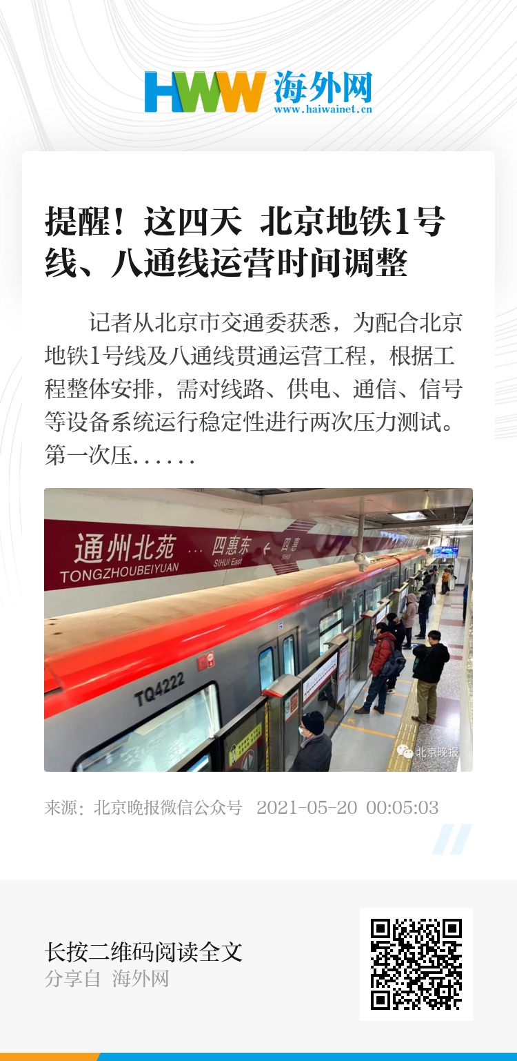 为保证工程顺利实施和地铁运营安全,最大限度减少社会影响,地铁运营企业经过多次专题研究及反复论证,确定了北京地铁1号线与八通线贯通运营工程压力测试方案,压力测试期间1号线、八通线运营时间有所调整,请乘客提前安排好出行计划。
