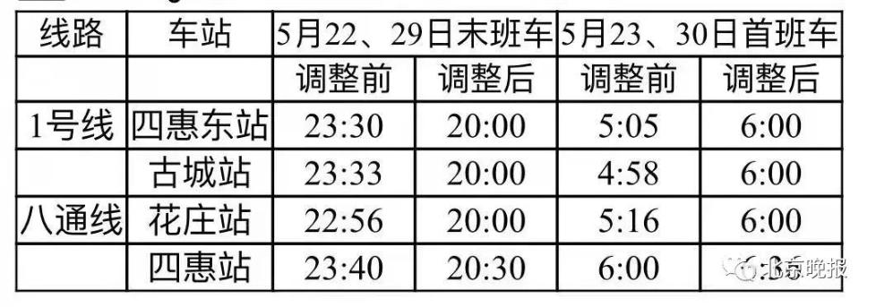5月22日,1号线四惠东站、古城站,八通线花庄站末班车均调整至20:00,八通线四惠站末班车调整至20:30。