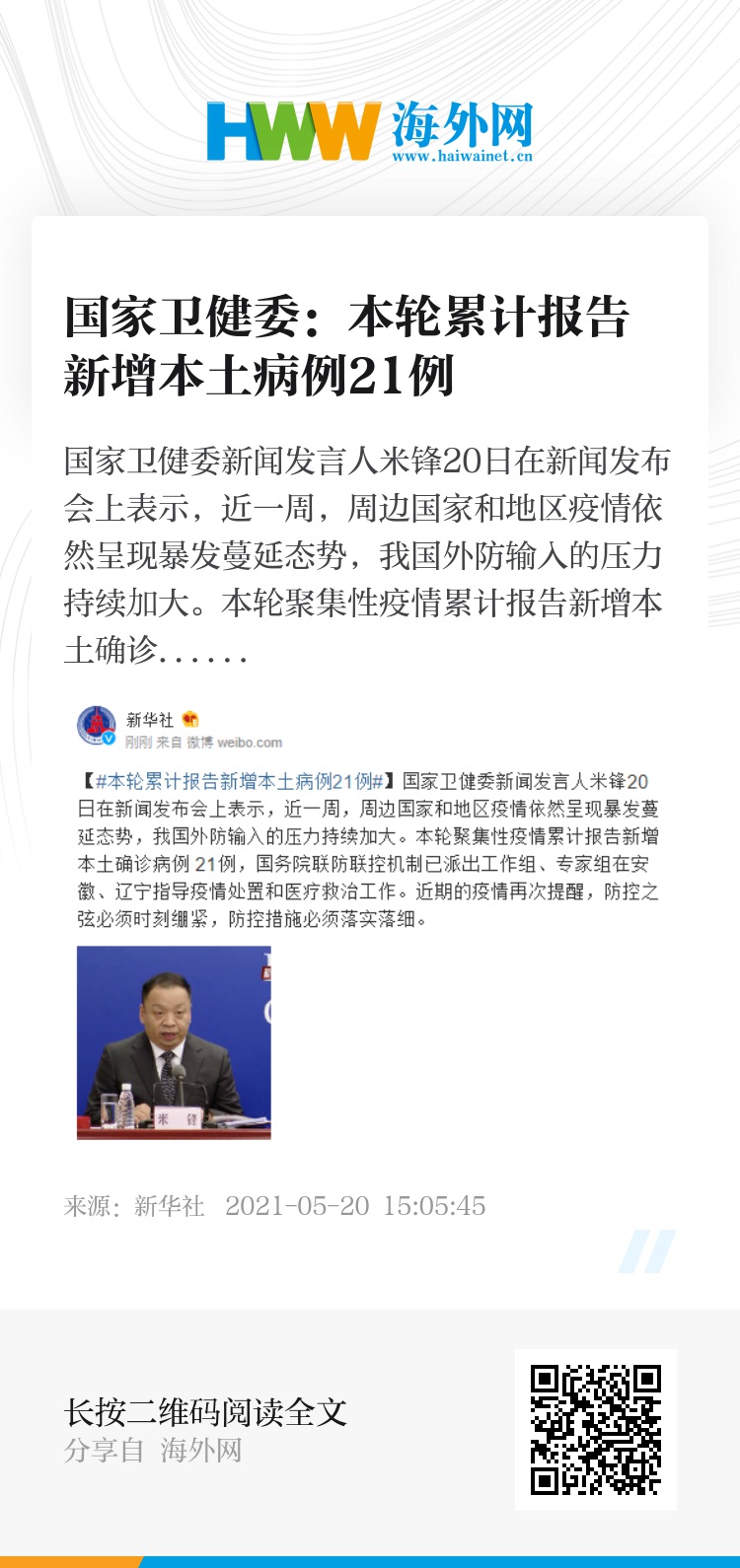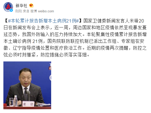 国家卫健委新闻发言人米锋20日在新闻发布会上表示,近一周,周边国家和地区疫情依然呈现暴发蔓延态势,我国外防输入的压力持续加大。本轮聚集性疫情累计报告新增本土确诊病例 21例,国务院联防联控机制已派出工作组、专家组在安徽、辽宁指导疫情处置和医疗救治工作。近期的疫情再次提醒,防控之弦必须时刻绷紧,防控措施必须落实落细。