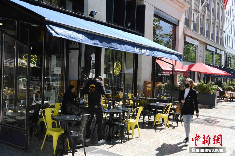 当地时间5月19日,法国启动第二阶段“解封”,部分恢复开放文化和餐饮场所。在巴黎市中心香榭丽舍大街,大多数餐饮场所已经恢复在露天平台的营业,街上人流比往日有所增加。中新社记者 李洋 摄