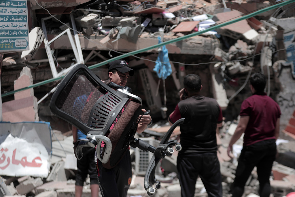 当地时间2021年5月18日,加沙地带Al-Rimal地区,当地六层建筑在以色列空袭中被毁,内含图书馆、大学生训练中心和青年中心。图源:人民视觉