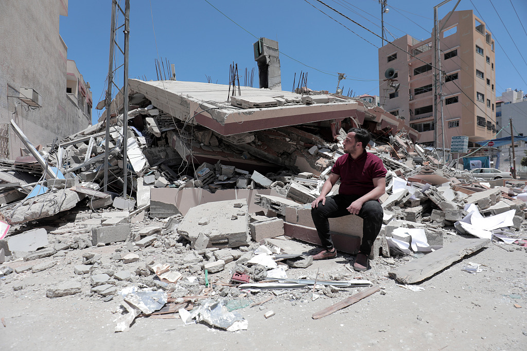 当地时间2021年5月18日,加沙地带Al-Rimal地区,当地六层建筑在以色列空袭中被毁,内含图书馆、大学生训练中心和青年中心。图源:人民视觉