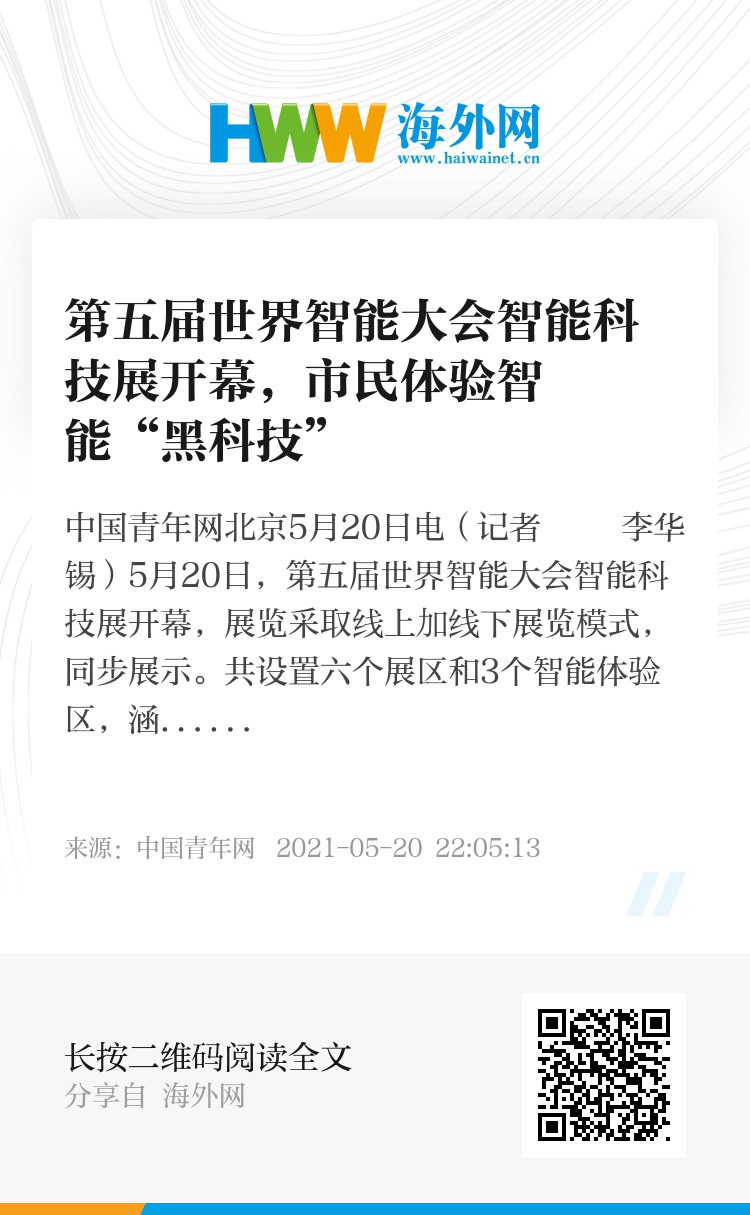 中国青年网北京5月20日电(记者 李华锡)5月20日,第五届世界智能大会智能科技展开幕,展览采取线上加线下展览模式,同步展示。共设置六个展区和3个智能体验区,涵盖科研与应用、智能制造、智慧城市和交通、智慧生活等智能产品和技术。市民观众现场体验智能“黑科技”。