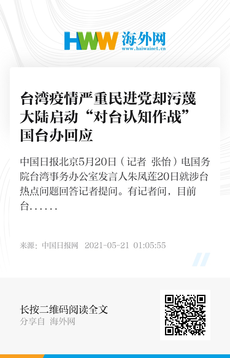 中国日报北京5月20日(记者 张怡)电国务院台湾事务办公室发言人朱凤莲20日就涉台热点问题回答记者提问。