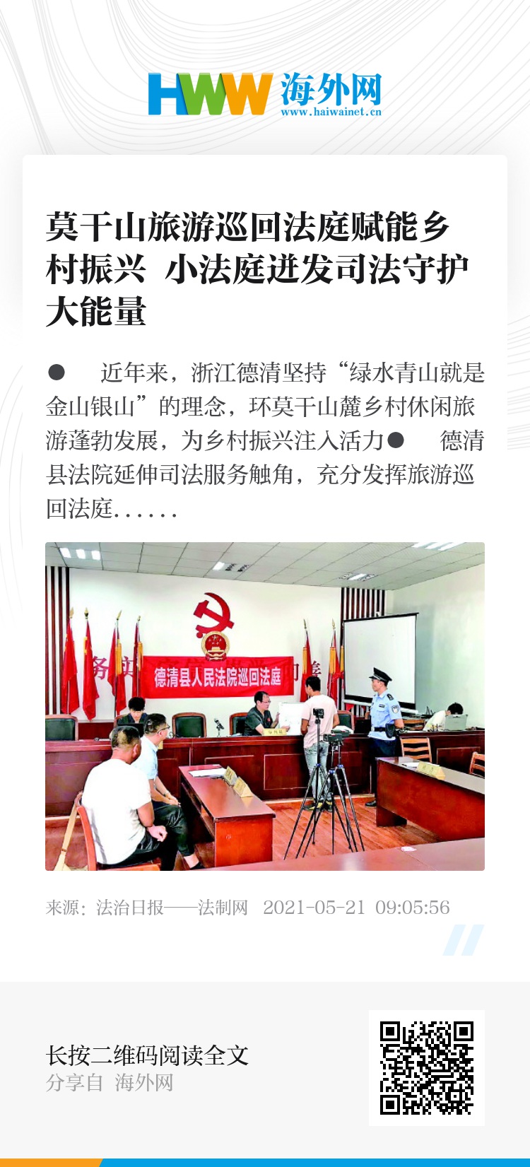 ● 德清县法院延伸司法服务触角,充分发挥旅游巡回法庭在服务旅游特色审判、辖区矛盾纠纷化解、风险隐患排查防范等方面的作用,为旅游经济提供强大司法服务保障