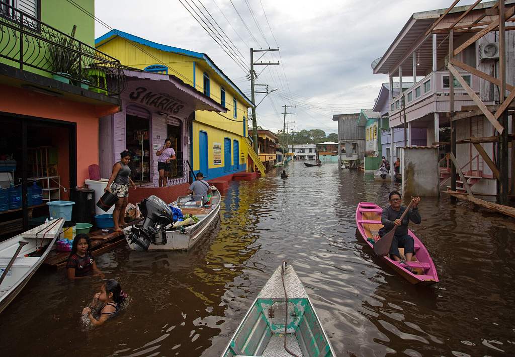 巴西部分地区持续遭遇洪灾 民众划船出行