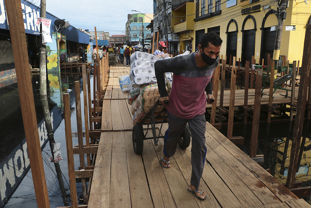 当地时间2021年5月20日,巴西马瑙斯,当地遭遇洪灾,街道被洪水淹没。图片来源:人民视觉