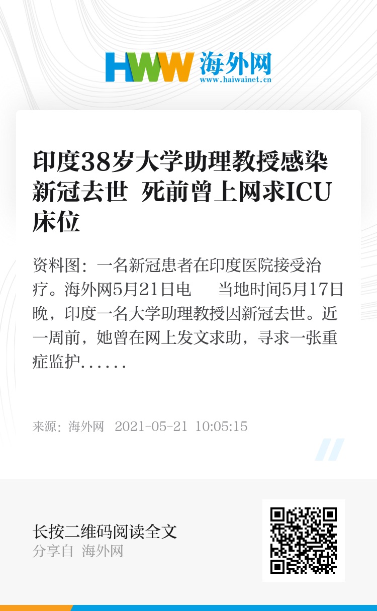 海外网5月21日电 当地时间5月17日晚,印度一名大学助理教授因新冠去世。近一周前,她曾在网上发文求助,寻求一张重症监护(ICU)床位。