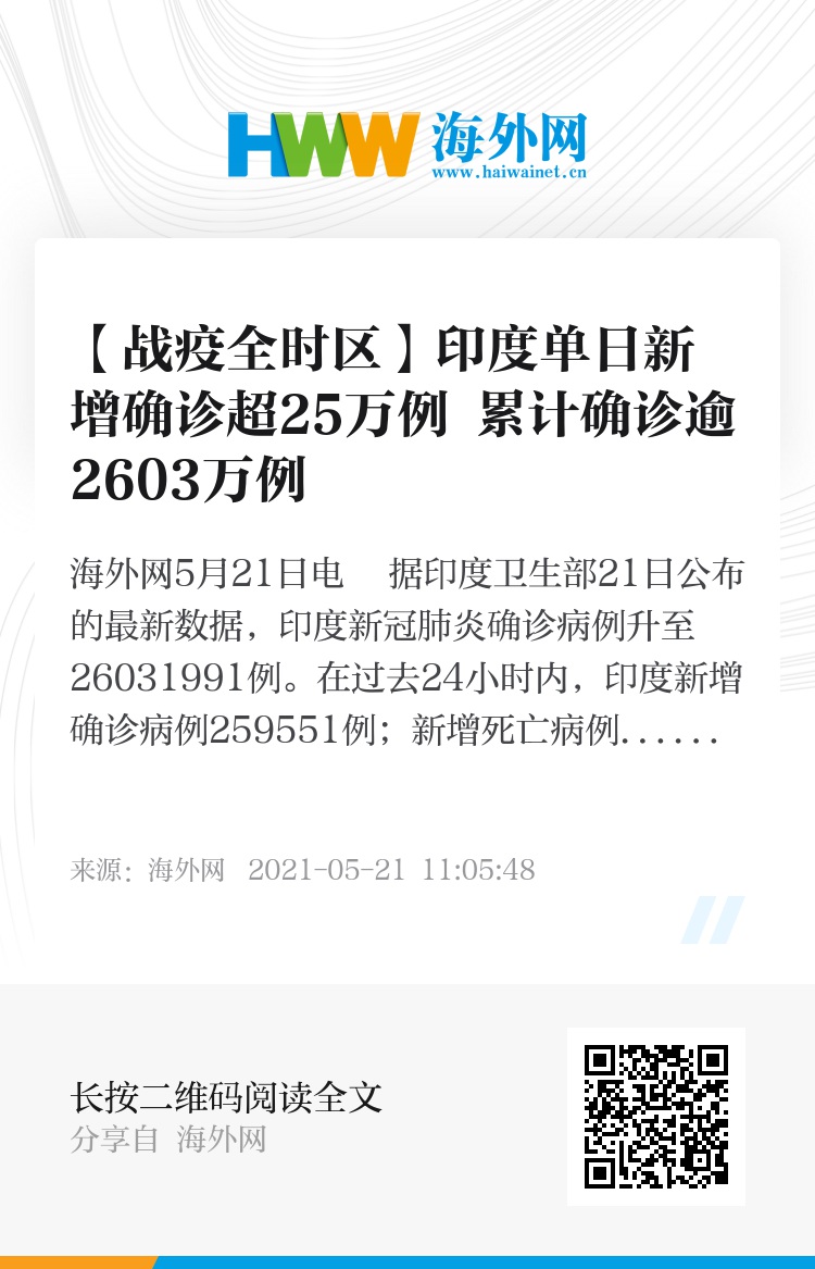 海外网5月21日电 据印度卫生部21日公布的最新数据,印度新冠肺炎确诊病例升至26031991例。在过去24小时内,印度新增确诊病例259551例;新增死亡病例4209例,累计死亡291331例。(海外网 张琪)