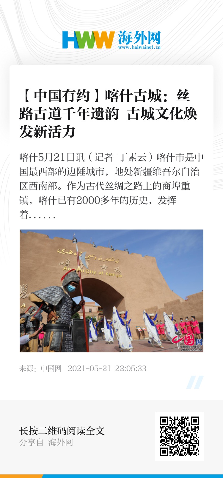中国网喀什5月21日讯(记者 丁素云)喀什市是中国最西部的边陲城市,地处新疆维吾尔自治区西南部。作为古代丝绸之路上的商埠重镇,喀什已有2000多年的历史,发挥着中西交通枢纽和商品集散地的重要作用。近些年,位于城市中心的喀什古城区以其厚重独特的历史文化、浓郁多彩的民族风情,吸引了越来越多世人的目光。5月19日,“中国有约 A Date with China”2021年国际媒体主题采访活动一行走进新疆喀什。
