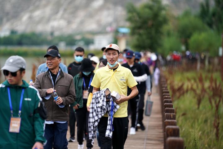 图为在西藏拉萨市拉鲁湿地的健身步道上,正在参加“2020年环拉鲁湿地健步走系列活动”的选手们(2020年9月5日摄)。新华社记者 詹彦 摄
