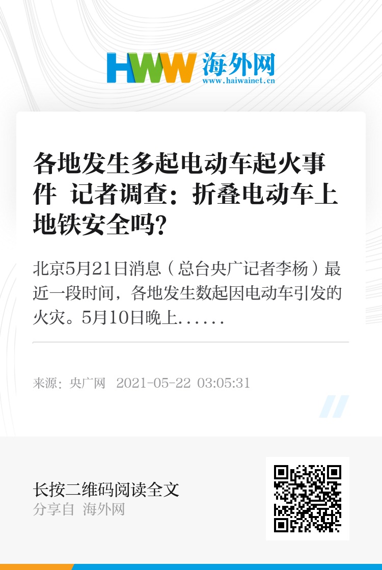 央广网北京5月21日消息(总台央广记者李杨)最近一段时间,各地发生数起因电动车引发的火灾。5月10日晚上,四川省成都市成华区一小区内发生电瓶车进入电梯起火爆燃事件,造成了多人受伤,其中还包括一名婴儿;5月14日凌晨,北京西城区某小区一户居民家突发火灾,不仅家中财物损毁严重,火灾还夺去了女主人的生命,据调查,该居民家中有7块电动自行车的锂电池,引发火情的是其中一块;5月17日,深圳一小区楼门口两台电动车猛烈燃烧,导致楼上多名租客被困。