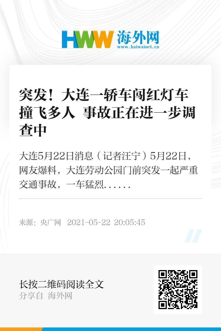 网友爆料称,5月22日12时许,在大连市中山区某路段,一轿车冲过斑马线,撞向斑马线上正常通过绿灯的人群,多名正在过马路的路人被撞伤。事发后,现场多人受伤倒地不起,肇事车辆径直行驶,未见减速。