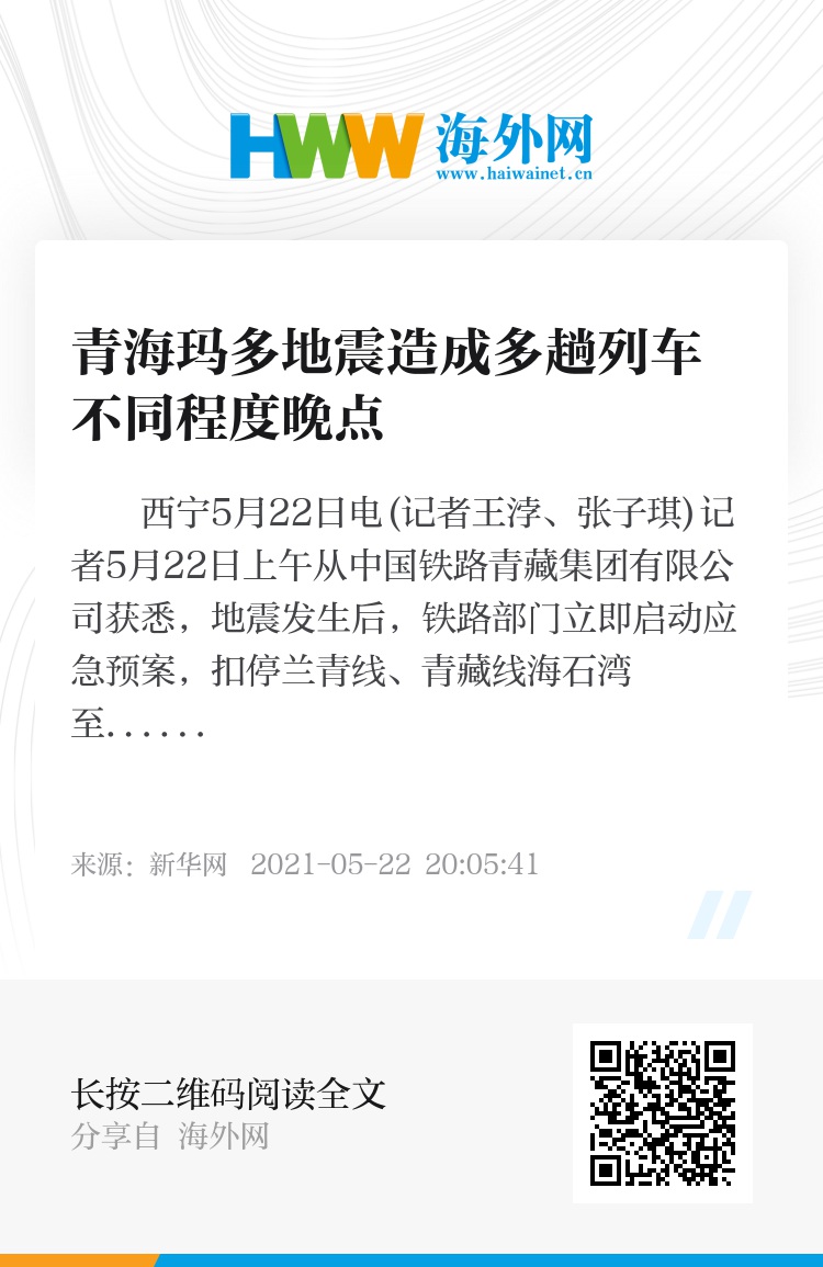 新华社西宁5月22日电(记者王浡、张子琪)记者5月22日上午从中国铁路青藏集团有限公司获悉,地震发生后,铁路部门立即启动应急预案,扣停兰青线、青藏线海石湾至青海湖站间在途列车,同时组织现场设备管理单位人员对兰青线、青藏线海石湾至青海湖站间,兰新客专民和南至浩门区间进行全面检查。经检查,确认海石湾至青海湖站上下行线路设备恢复正常。兰新客专线按相关规定要求限速运行,目前正逐步恢复常速。