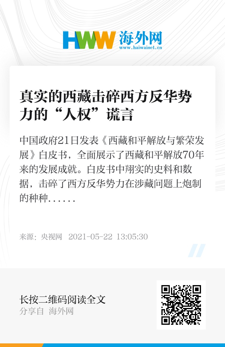 中国政府21日发表《西藏和平解放与繁荣发展》白皮书,全面展示了西藏和平解放70年来的发展成就。白皮书中翔实的史料和数据,击碎了西方反华势力在涉藏问题上炮制的种种“人权”谎言,让世界看到了一个真实、立体的西藏。