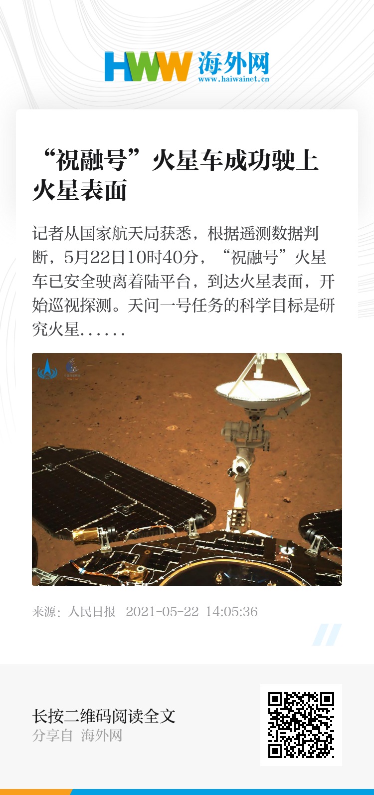 记者从国家航天局获悉,根据遥测数据判断,5月22日10时40分,“祝融号”火星车已安全驶离着陆平台,到达火星表面,开始巡视探测。