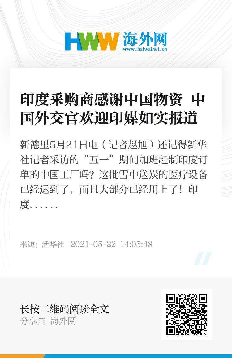 新华社新德里5月21日电(记者赵旭)还记得新华社记者采访的“五一”期间加班赶制印度订单的中国工厂吗?这批雪中送炭的医疗设备已经运到了,而且大部分已经用上了!印度采购商说,中国物资保质保量、价格合理、交付迅速,非常感谢。