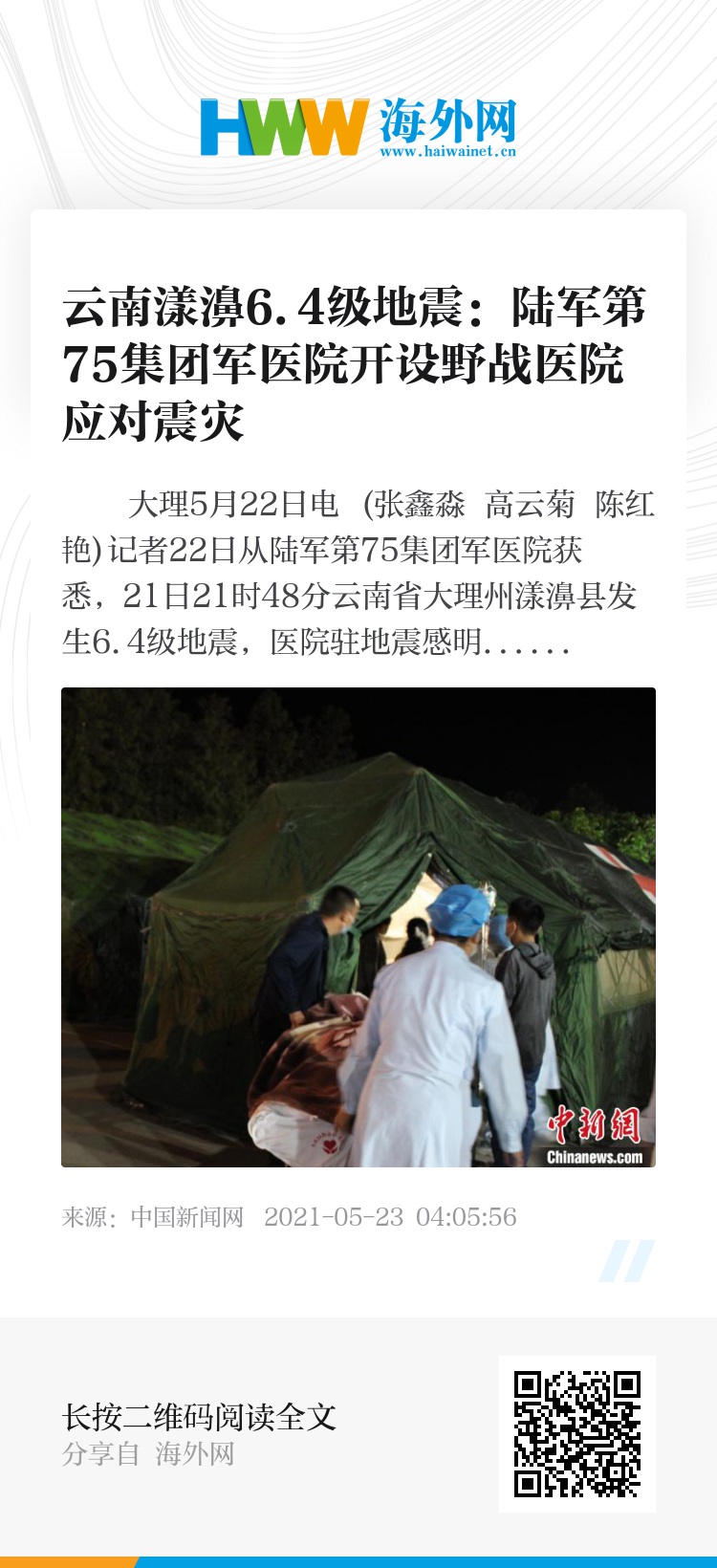 中新网大理5月22日电 (张鑫淼 高云菊 陈红艳)记者22日从陆军第75集团军医院获悉,21日21时48分云南省大理州漾濞县发生6.4级地震,医院驻地震感明显,第一时间启动预案、组织野战医疗队搭建野战帐篷、转移病房患者,并准备物资器材,随时准备出动。