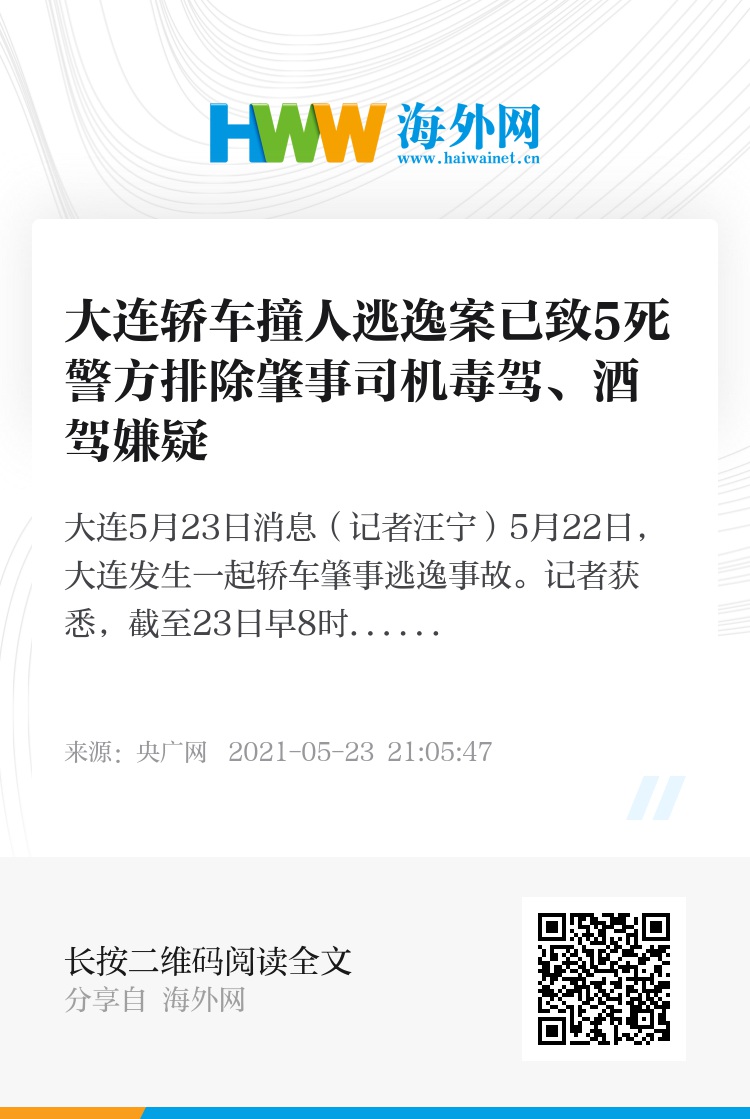央广网大连5月23日消息(记者汪宁)5月22日,大连发生一起轿车肇事逃逸事故。记者获悉,截至23日早8时,事故已造成5人死亡(4人当场死亡,1人经送医抢救无效死亡),5名伤者正在医院治疗。