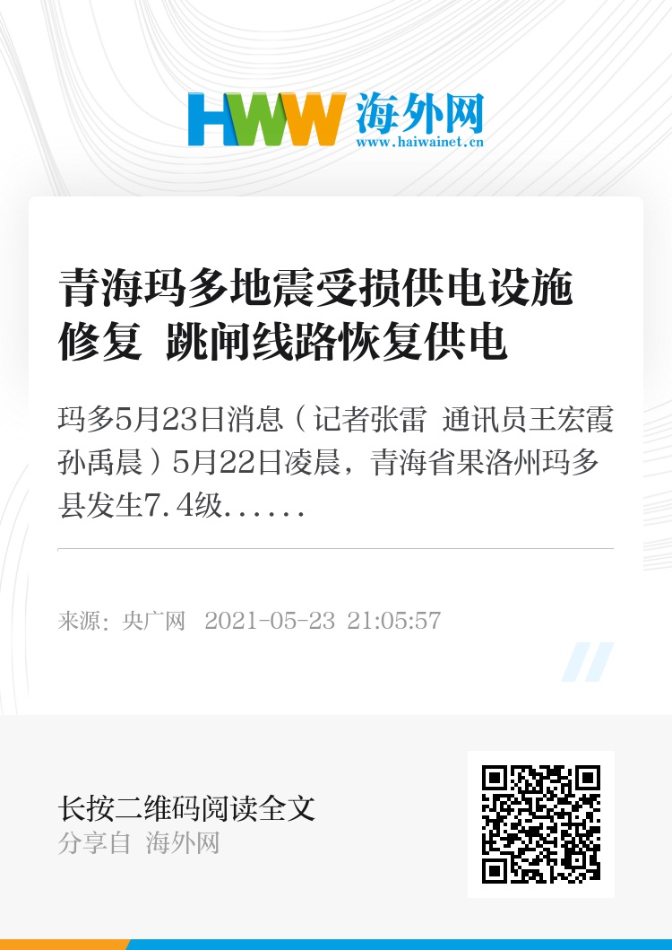 央广网玛多5月23日消息(记者张雷 通讯员王宏霞 孙禹晨)5月22日凌晨,青海省果洛州玛多县发生7.4级地震,受地震和多次余震影响,果洛地区供电设施局部受损,5条输配电线路跳闸,影响玛多县黄河乡、玛沁县优云乡21个公变、9个台区、805户客户正常用电。
