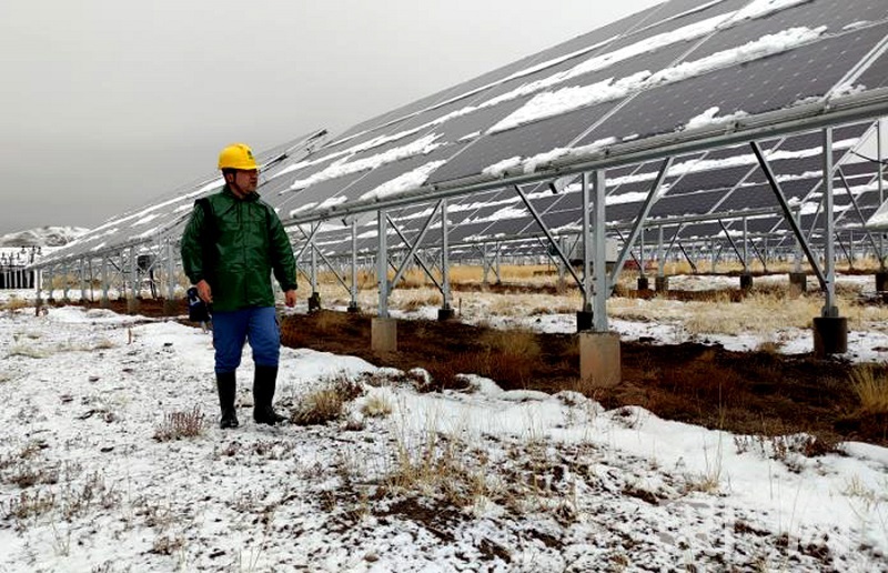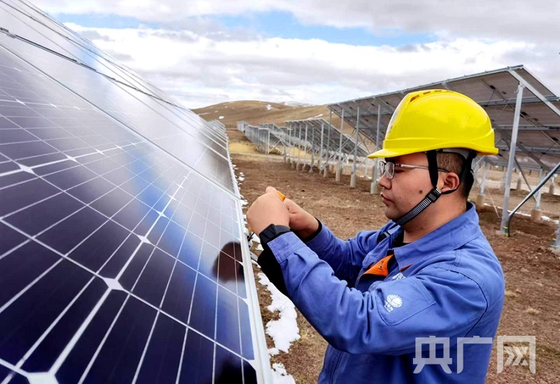 国网青海电力员工对玛多4.4兆瓦光伏扶贫电站运行情况进行特巡(央广网发 王宏霞供图)