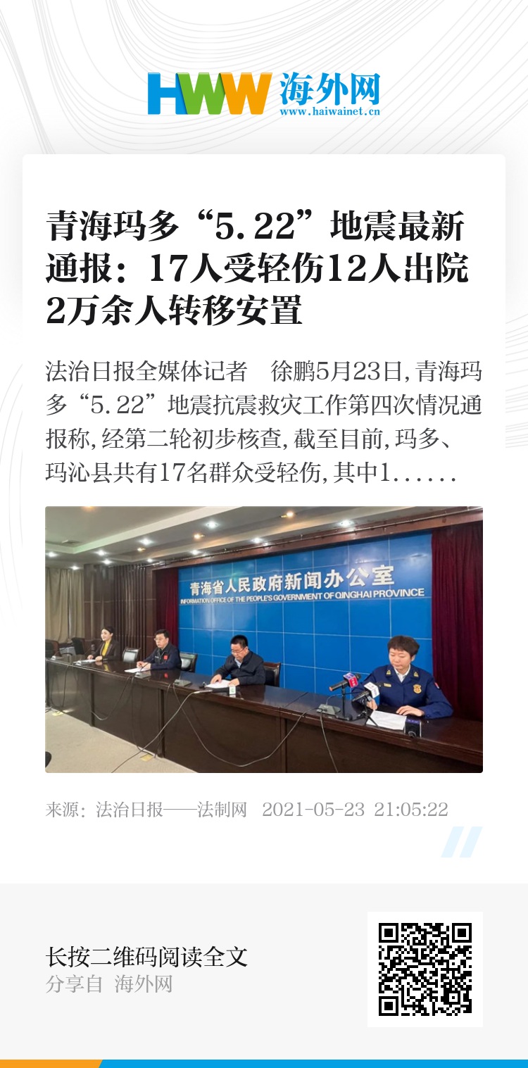 5月23日,青海玛多“5.22”地震抗震救灾工作第四次情况通报称,经第二轮初步核查,截至目前,玛多、玛沁县共有17名群众受轻伤,其中12人已治疗出院。避险转移安置2万余人。