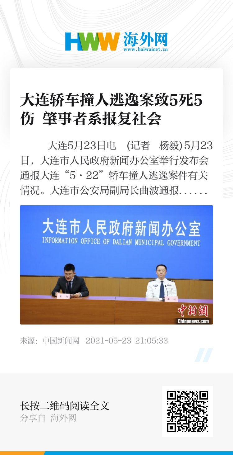 中新网大连5月23日电 (记者 杨毅)5月23日,大连市人民政府新闻办公室举行发布会通报大连“5·22”轿车撞人逃逸案件有关情况。大连市公安局副局长曲波通报称,犯罪嫌疑人刘某因投资失败无法接受,失去生活信心,遂产生报复社会心理。