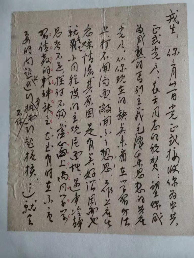 “戎生,你这几年来,学习进步一定很好。我们天天在这里希望你进步……我们身体很好,工作也很顺利,不要挂念。祝你和你弟弟身体好,并祝进步!”