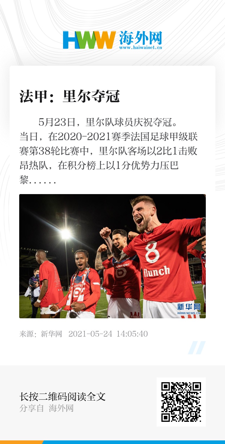 当日,在2020-2021赛季法国足球甲级联赛第38轮比赛中,里尔队客场以2比1击败昂热队,在积分榜上以1分优势力压巴黎圣日耳曼队,夺得法甲冠军。