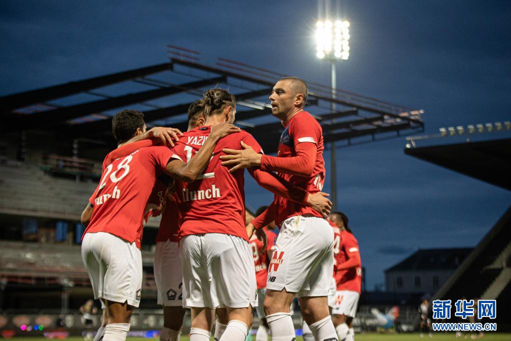 5月23日,里尔队球员伊尔马兹(左一)进球后与队友庆祝。