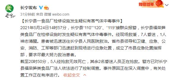截至20时50分,5人经抢救无效死亡,其余2名昏迷人员正在抢救。警方已对长宁县福荣笋类食品厂法人依法进行了控制调查。事件原因正在深入调查中,有关处置工作正在有序进行。(完)