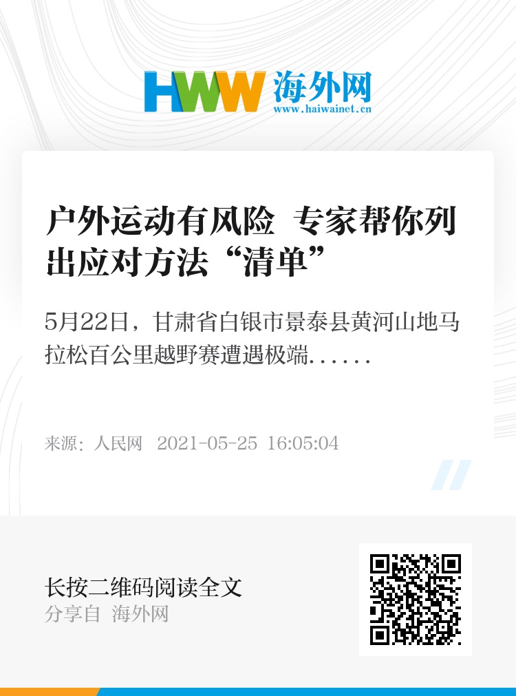 5月22日,甘肃省白银市景泰县黄河山地马拉松百公里越野赛遭遇极端天气,21名运动员不幸遇难。如今,户外运动已成为一种时尚的运动方式,由于其多样化、个性化的特点,又能够让人在拥抱大自然的同时挑战自我,受到不少人青睐。但是,北京市红十字会紧急救援中心999急救中心急诊科副主任包文华提醒大家,户外运动具有一定的风险性,遇到后应该冷静应对。