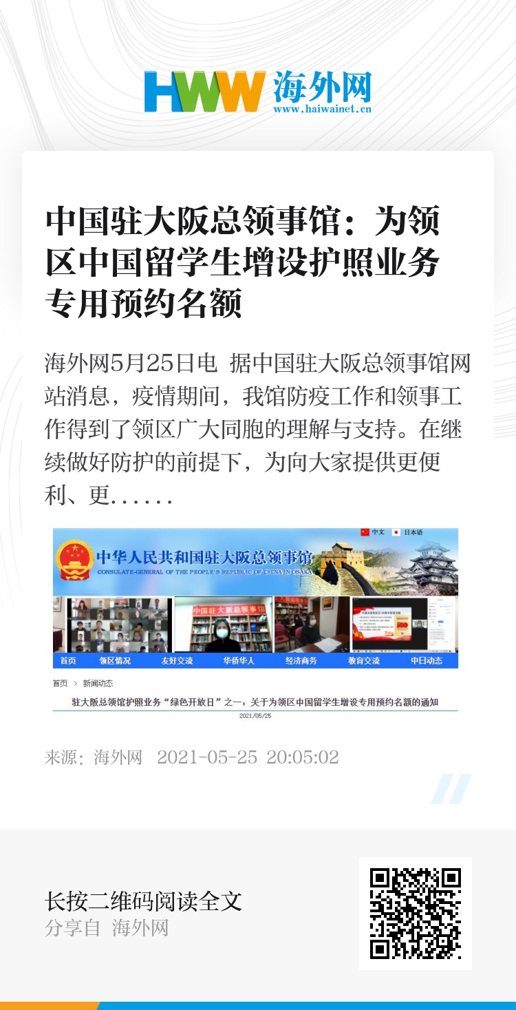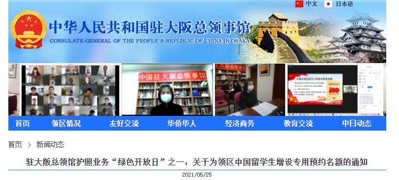 海外网5月25日电 据中国驻大阪总领事馆网站消息,疫情期间,我馆防疫工作和领事工作得到了领区广大同胞的理解与支持。在继续做好防护的前提下,为向大家提供更便利、更优质的领事证件服务,现面向领区广大中国留学生增设护照业务“绿色开放日”,具体如下: