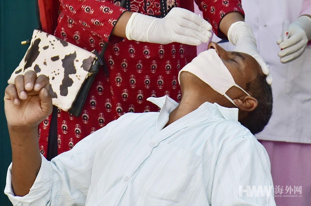 当地时间2021年5月24日,据印度卫生部24日公布的新冠疫情数据,印度累计新冠肺炎死亡病例达到303720例,成为继美国、巴西后第三个累计死亡病例数超30万例的国家。图为当地时间2021年5月24日,印度阿姆利则,民众接受新冠病毒检测。(供图:东方IC)