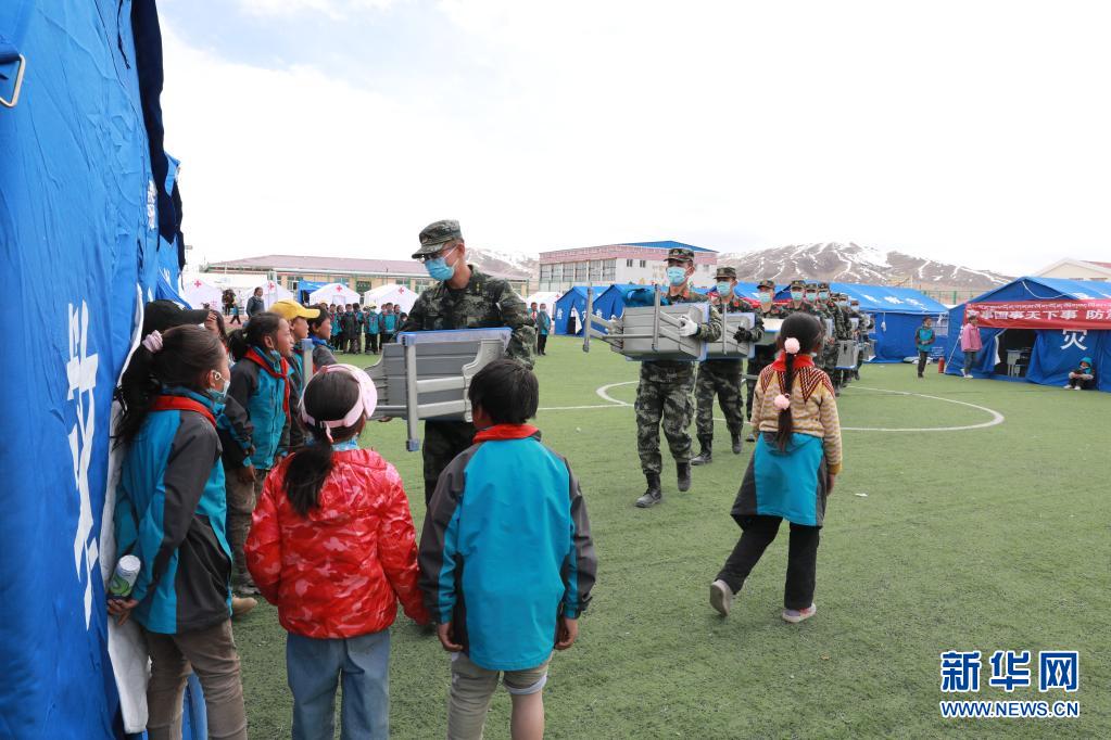课上,他还和孩子们做起了游戏——分别拿出一根和一捆筷子,让大家尝试折断。“一根筷子易折断,十根筷子抱成团。”孩子们悟出了这个道理。课快结束时,张国睿问大家是否愿意像他一样成为一名军人。同学们齐声回答:“愿意!”当问为什么时,一个小男孩站起来大声回答:“我也要像你们一样帮助他人!”图为5月24日,武警青海总队果洛支队机动大队排长张国睿(前一)和战友为花石峡镇藏文中心寄宿制小学的帐篷教室搬运课桌。新华社记者 刘芳 摄