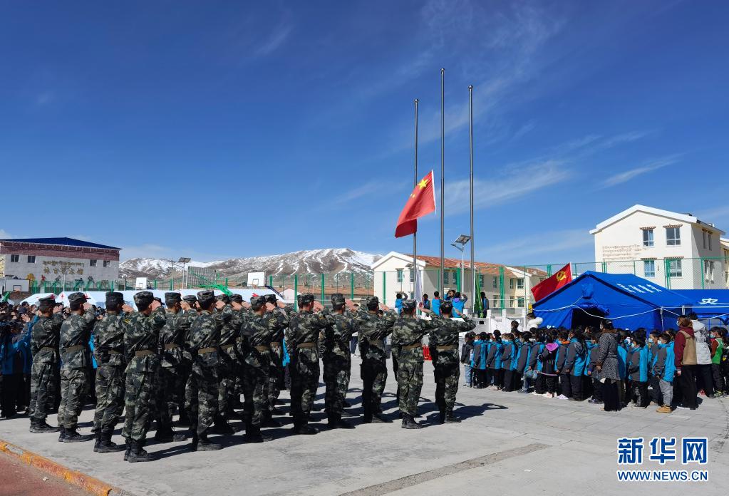 图为5月24日,武警青海总队果洛支队机动大队官兵与花石峡镇藏文中心寄宿制小学的师生一同参加升国旗仪式。新华社发(宦爵才郎 摄)