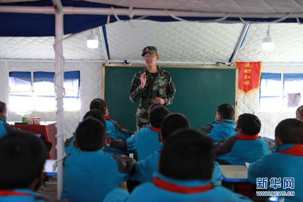 5月24日下午3时,排长张国睿又一次认真检查了自己的着装。他要去给孩子们上一节课,为此他已准备了一个通宵。当日是青海果洛玛多县花石峡镇藏文中心寄宿制小学震后复学第一天,学校邀请他以“国家、奋斗、团结”为主题,和孩子们进行交流。这是地震发生以来,学生们上的第一堂课。图为5月24日,武警青海总队果洛支队机动大队排长张国睿为花石峡镇藏文中心寄宿制小学的孩子上课。新华社记者 刘芳 摄