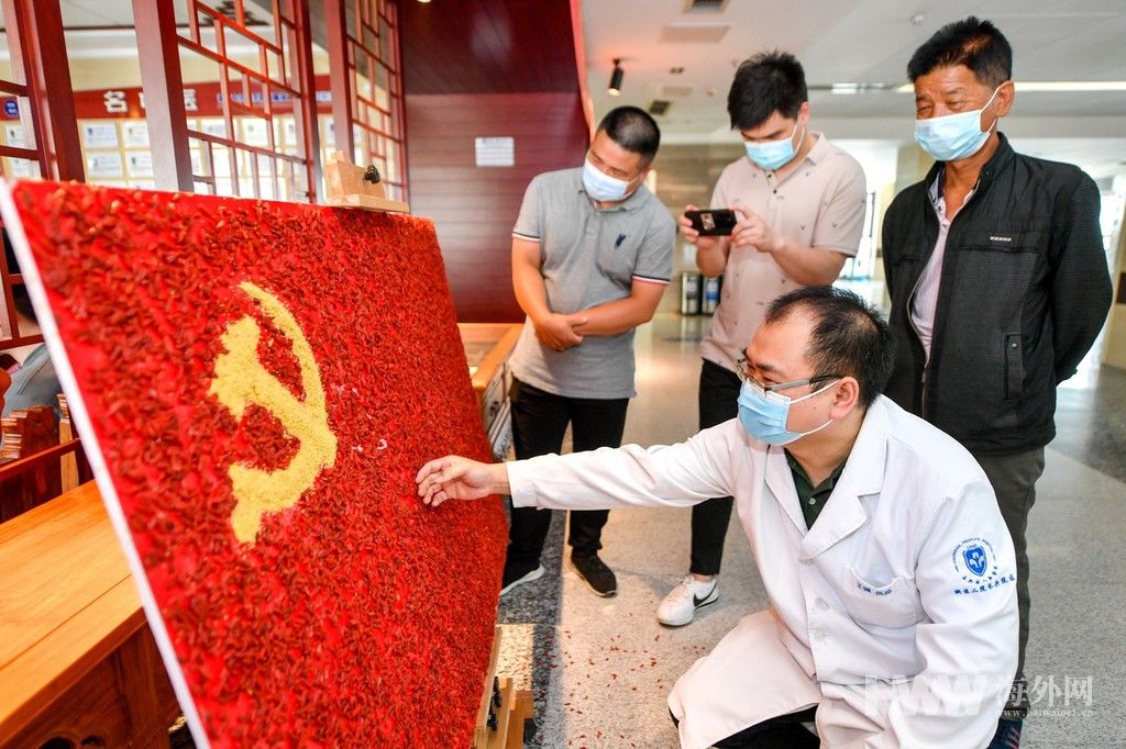 5月25日,浙江省湖州市长兴县人民医院国医馆,中医师正在利用中药材拼制党旗。该院结合中医传统文化和中医师职业特长,用枸杞、秫米等中药材拼出的一面长144厘米、宽96厘米的党旗,以特殊的方式献礼建党100周年。(供图:东方IC)