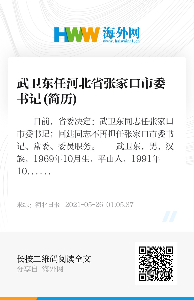 日前,省委决定:武卫东同志任张家口市委书记;回建同志不再担任张家口市委书记、常委、委员职务。