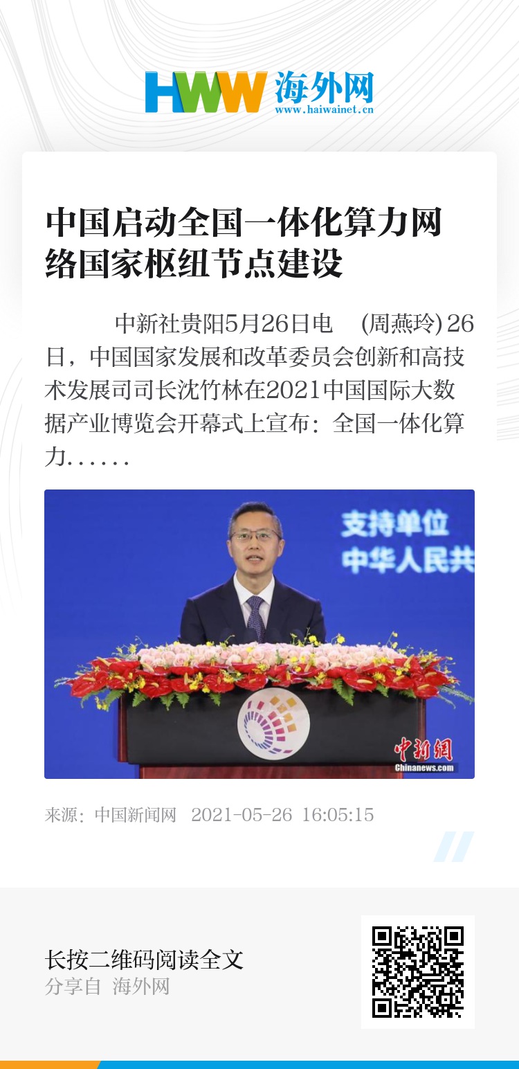 中新社贵阳5月26日电 (周燕玲)26日,中国国家发展和改革委员会创新和高技术发展司司长沈竹林在2021中国国际大数据产业博览会开幕式上宣布:全国一体化算力网络国家枢纽节点建设正式启动。