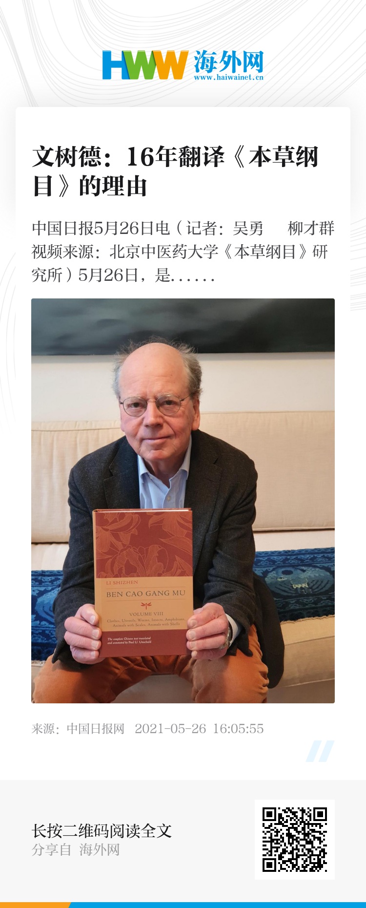 中国日报5月26日电(记者:吴勇 柳才群 视频来源:北京中医药大学《本草纲目》研究所)5月26日,是《本草纲目》入选UNESCO世界记忆名录10周年。这背后有一位德国人默默做了大量工作,而且近20年来,他一直在努力做一件事——把《本草纲目》翻译成英文。他就是文树德先生。