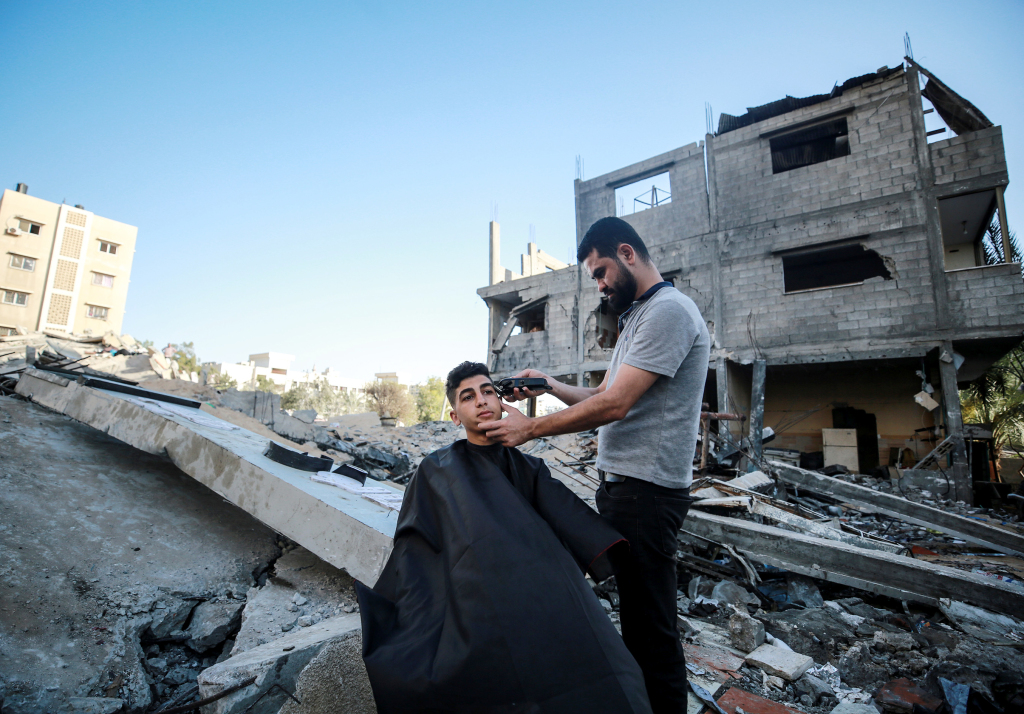 当地时间2021年5月25日,加沙,巴勒斯坦理发师Hashim Al-Jarousha在废墟中为民众理发。据悉,他的理发店在巴以冲突中遭以色列空袭被摧毁。图片来源:澎湃影像