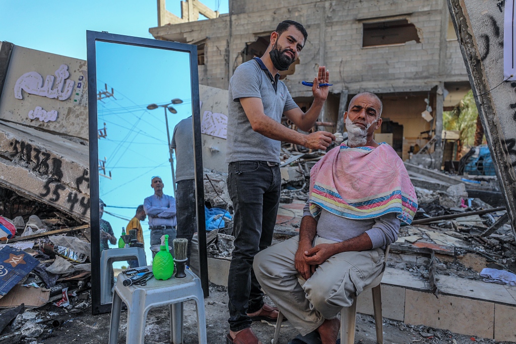 当地时间2021年5月25日,加沙,巴勒斯坦理发师Hashim Al-Jarousha在废墟中为民众理发。据悉,他的理发店在巴以冲突中遭以色列空袭被摧毁。图片来源:澎湃影像