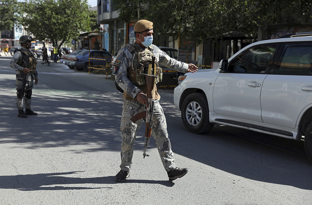 当地时间2021年5月25日,阿富汗喀布尔,阿富汗安保人员在澳大利亚驻阿富汗大使馆附近检查车辆。图片来源:人民视觉
