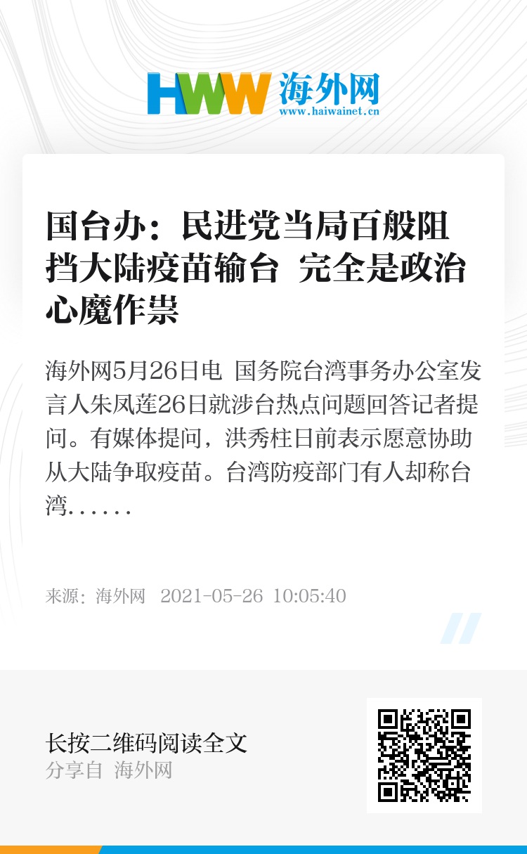 在台湾地区疫情肆虐、疫苗严重短缺、台湾民众急盼接种疫苗的情况下,民进党当局仍百般阻挡大陆疫苗输台,完全是政治心魔作祟。近日岛内许多县市和民间机构呼吁让台湾民众尽快用上大陆疫苗,也有调查显示近一半的台湾民众愿意立刻接种合格疫苗,这些都充分体现了台湾民众对大陆疫苗的信心。民进党当局对此置若罔闻,并编造谎言,抹黑大陆疫苗,实质是对台湾同胞生命健康的漠视。